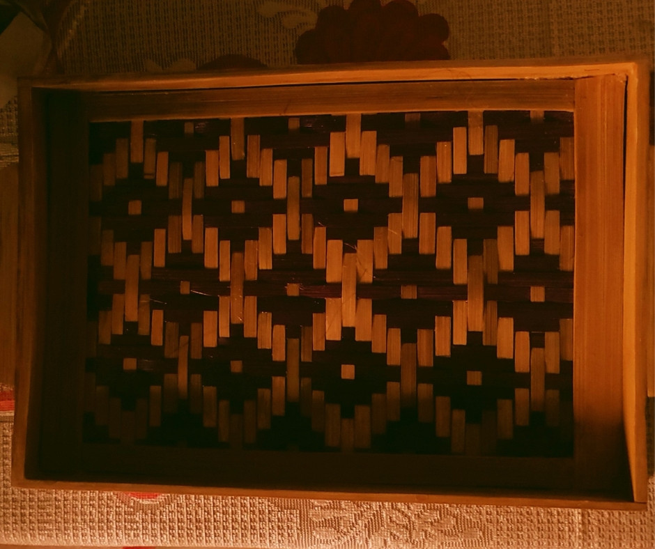 কারুকার্য: ট্রের ভেতরের অংশে বাঁশের চটা দিয়ে তৈরি আকর্ষণীয় জ্যামিতিক প্যাটার্ন বা নকশা রয়েছে।